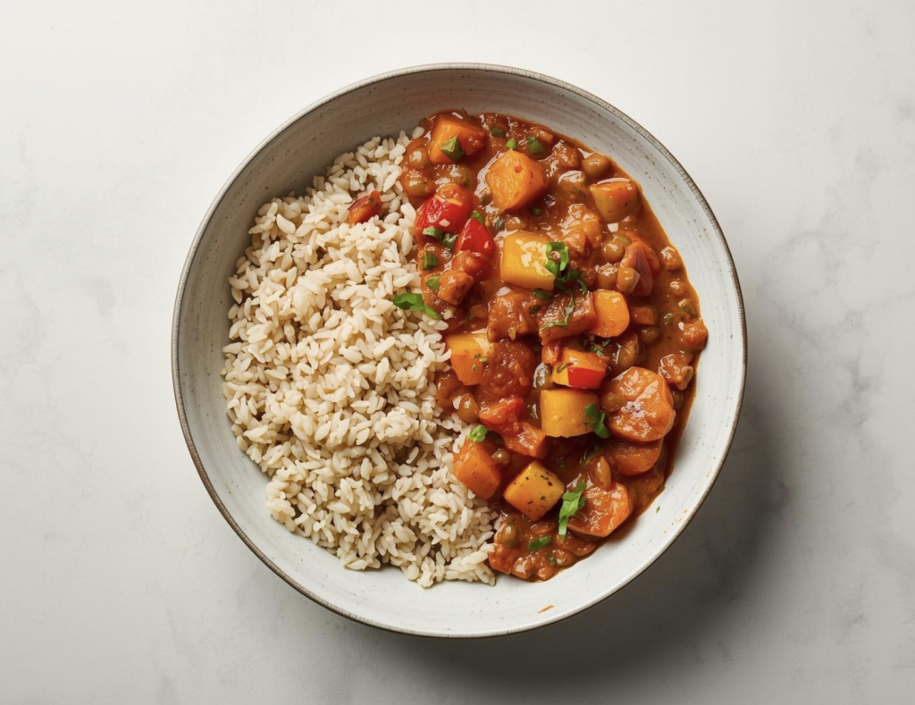 Dieses schnelle Vollkornreis-Linsen-Curry ist das ideale gesunde Rezept für eine ausge-wogene Mahlzeit. Mit proteinreichen Linsen, nahrhaftem Vollkornreis und frischem Gemüse lässt sich das Curry in nur 20 Minuten zubereiten. Perfekt für alle, die ein leckeres, einfaches und sättigendes Gericht suchen, das gleichzeitig nährstoffreich und vegetarisch ist.